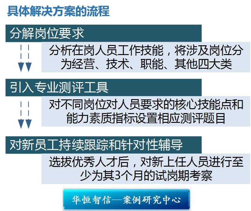 在以往实施竞聘上岗的过程中,与大多企业类似,快达公司采取笔试、面试相结合的评选方式,而在面试的过程中,采取评委打分的方式。以这种方式选拔人员,就很容易受到评委人员的主观因素影响。由于每个人对优秀人才的认识不同,比如有的人认为“沟通能力强”是最重要的要素,而有的人则认为“执行力强,会办事”是最重要的因素,而各个岗位对人员能力素质的要求又各不相同,这就造成了“谁是优秀人才”的难题。再加上每个人对能力强弱的判断标准不同,有的人评价标准高一些,而有的人评价标准相对低一些,这就给评价结果带来了非常严重的主观因素影响。除此之外,大多中国企业都存在人情因素,这也会造成评选结果的不公平、不公正。基于上述这些问题,公司也难以实现公平、公正、科学的人员选拔。针对此,华恒智信顾问专家提出,基于核心岗位任职资格的分析和判断,引入专业的人才测评工具,以实现真正公平、公正、科学的人员选拔。