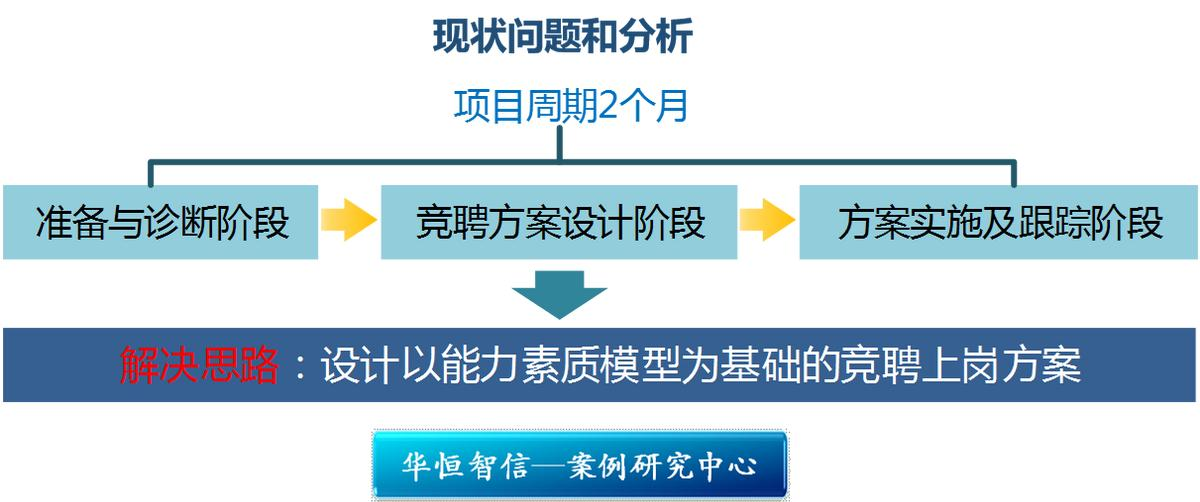 本次项目主要分为三个阶段,分别为:准备与诊断阶段、竞聘方案设计阶段、方案实施及跟踪阶段,项目周期约2个月。项目启动会结束后,华恒智信顾问专家团队即进驻企业,开展深入的沟通访谈工作,以深入分析公司领导的咨询需求及公司的管理问题。在系统诊断工作的基础上,针对竞聘上岗方案的设计,华恒智信顾问团队提出“设计以能力素质模型为基础的竞聘上岗方案”的解决思路,并在这个过程中引入了专业的人才测评工具,以帮助企业选拔真正合适的管理干部。