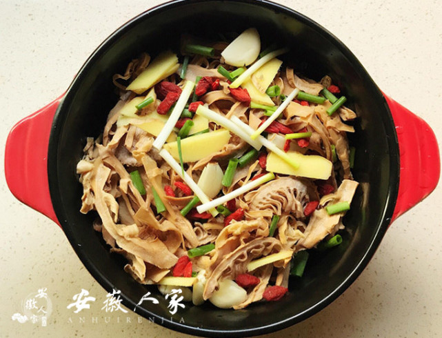 3.大概炖30分钟后,加入笋干,放盐、五香粉调味,转小火炖30分钟。