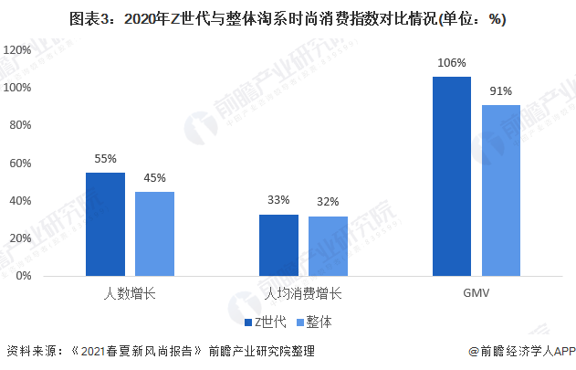 新世代贡献时尚消费人群增量,驱动服装行业高速增长。Z世代指的是1995~2010年之间出生的青少年,2020年我国Z世代人口约2.26亿,占总人口16%。Z世代生活在相对富裕,良好文化教育和各种新事物冲击的环境中,因此具有更前卫的消费观和追求时尚意识。据天猫服饰风尚事业部和阿里妈妈联合发布的《2021春夏新风尚报告》,2020年淘系时尚消费人群整体增长45%,时尚消费大盘GMV增长91%,而其中Z世代人群增长达到55%,人均消费增长33%,GMV增长106%,均高于大盘的增速,成为时尚消费驱动力之一。