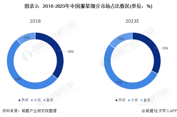 数据显示,我国服装细分市场中女装占比最大,2018年国内服装行业零售收入中男装、女装和童装分别为8258亿元、12249亿元和2601亿元,女装占比为53%。业内预测,2023年我国服装细分市场中男装、女装和童装将保持9.6%、11.5%、18.4%的年均复合增速,最后男装、女装和童装的零售收入将有望达到13070亿元、21077亿元和6041亿元。