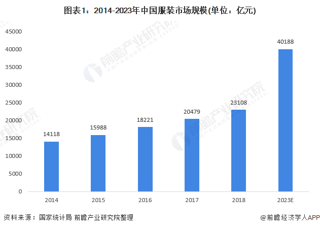 2014-2018年,我国的服装行业零售收入逐年增加,2018年国内服装行业零售收入达23108亿元,年复合增长率为13.1%,并有望在2023年复合增速至40188亿元。