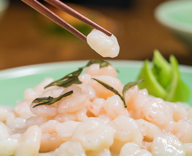 虾仁白如玉,味鲜嫩;茶芽:叶碧绿,闻清香。将色泽雅丽,滋味独特的龙井茶和河虾仁放在一起炒,食后清口开胃,回味无穷,堪称一绝。