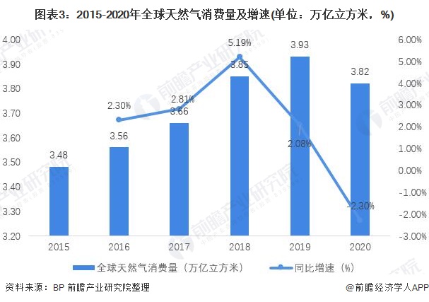 根据英国石油公司(BP)统计数据显示,2015-2019年全球天然气消费量呈增长趋势,增速呈波动趋势。而根据英国石油公司的数据,2020年全球天然气消费量下降2.3%至3.82万亿立方米。