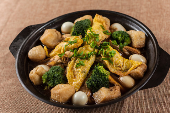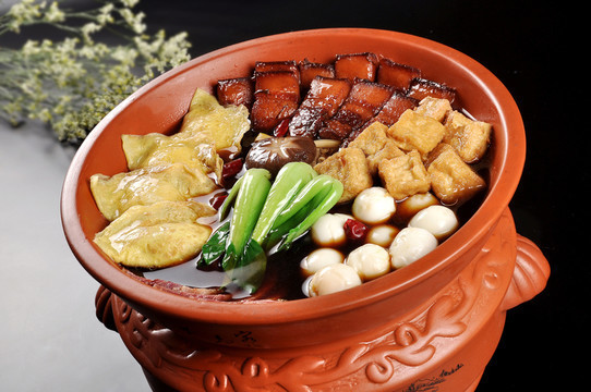 这高汤也非常讲究,是用鸡鸭的脚筋、海参、猪肚、冬菇、鲜虾等各处的美食汇聚一起加上葱姜蒜、黄酒、醋之类的调料煮出来的,光是汤料的准备就得花费一天的时间。将汤汁倒入用猛火将水煮开,再用文火煨,期间要用汤勺将原汤从上往下不停地浇灌,以渗透各层。汤头浇得好的表现就是油而不腻,烂而不化,热而不烫,冷而不却,色香味俱全。