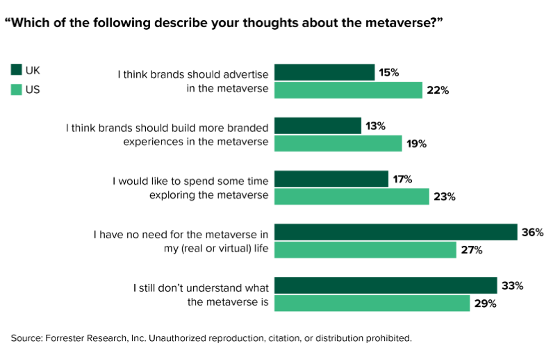 人们对于元宇宙的接受度能否跟得上元宇宙的发展速度也是一个挑战。为此,Forrester Research(美国一家咨询公司)进行了调查。样本包含了1,263 接受调查的人,当中572 名来自美国;691 名来自英国。