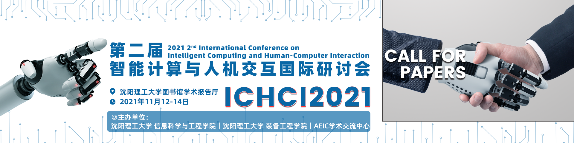 第二届智能计算与人机交互国际研讨会(ICHCI 2021)由沈阳理工大学 信息科学与工程学院,沈阳理工大学 装备工程学院,AEIC学术交流中心联合主办,由东北大学、沈阳航空航天大学、沈阳建筑大学、大连大学、重庆大学、北京交通大学、南京理工大学、华南理工大学、四川大学、吉林大学、西南交通大学、武汉大学、大连工业大学、中山大学、大连理工大学、浙江大学、天津大学、南京航空航天大学、西安交通大学联合协办,定于2021年11月12-14日中国·沈阳理工大学图书馆学术报告厅隆重举行。诚邀各位学者、研究人员和学生积极发表智能计算与人机交互交叉领域未发表的原创研究论文和重要正在进行的论文、研究成果;并热烈欢迎国内外高校、科研机构专家、学者,企业界人士及其他相关人员参会交流。ICHCI 2021的目标是解决与人机交互有关的智能计算的主要问题,会议期间将见证一些国家、国际代表和研究人员分享在智能计算、人机交互与通信等领域的观点和新想法,并为研究人员提供机会,在解决智能计算和人机交互领域的问题方面,讨论最新的解决方案、科学成果和方法。ICHCI 2021的主题是“人际交互的未来发展”。