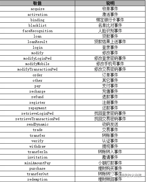 常见的事件是被包含在不同的场景中,API调用需要对应到不同的场景,例如:注册,修改,登录,贷款,提现等都是我们具体的场景,而事件又包括哪些类型,以下列出来的明细,几乎包括了常见的类型: