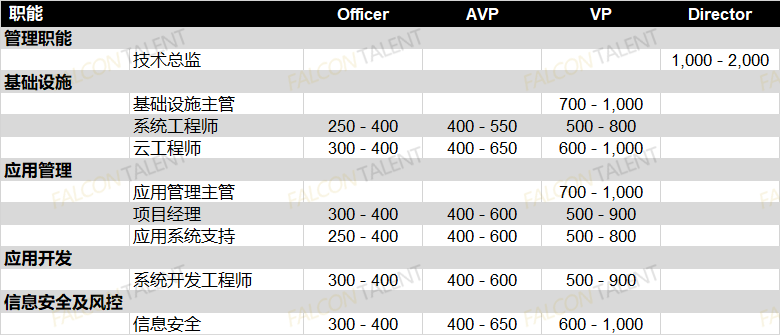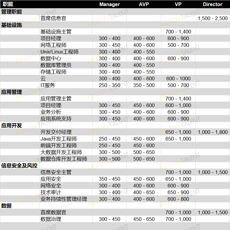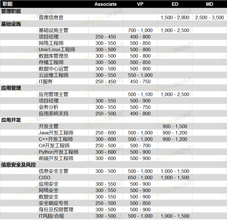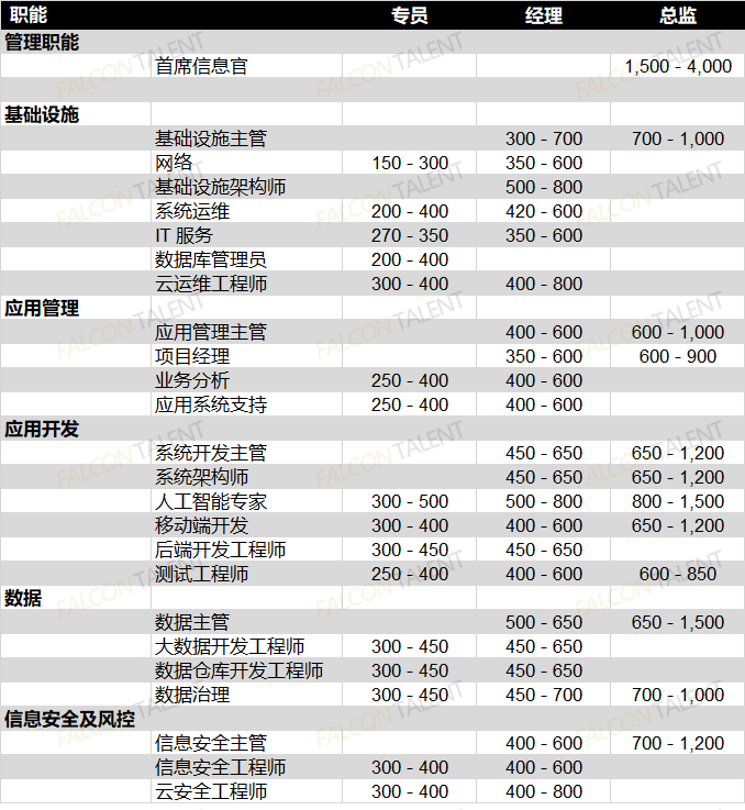 除了以上几点外资银行和券商各自不同的招聘需求之外,数据、信息安全和云领域人才的招聘同样火热。通过设立首席数据官及数据治理岗,外资券商和银行旨在加强数据治理,提高数据质量,充分发挥数据价值,提升经营管理水平。同时随着云技术在券商和银行业的应用,熟悉阿里云、腾讯云、AWS运营和安全管理,精通英语的技术人才也是市场上稀缺的。金融机构对网络安全的日益重视也让信息安全、IT风控的从业人员薪资比其他同职级的岗位高出一截。