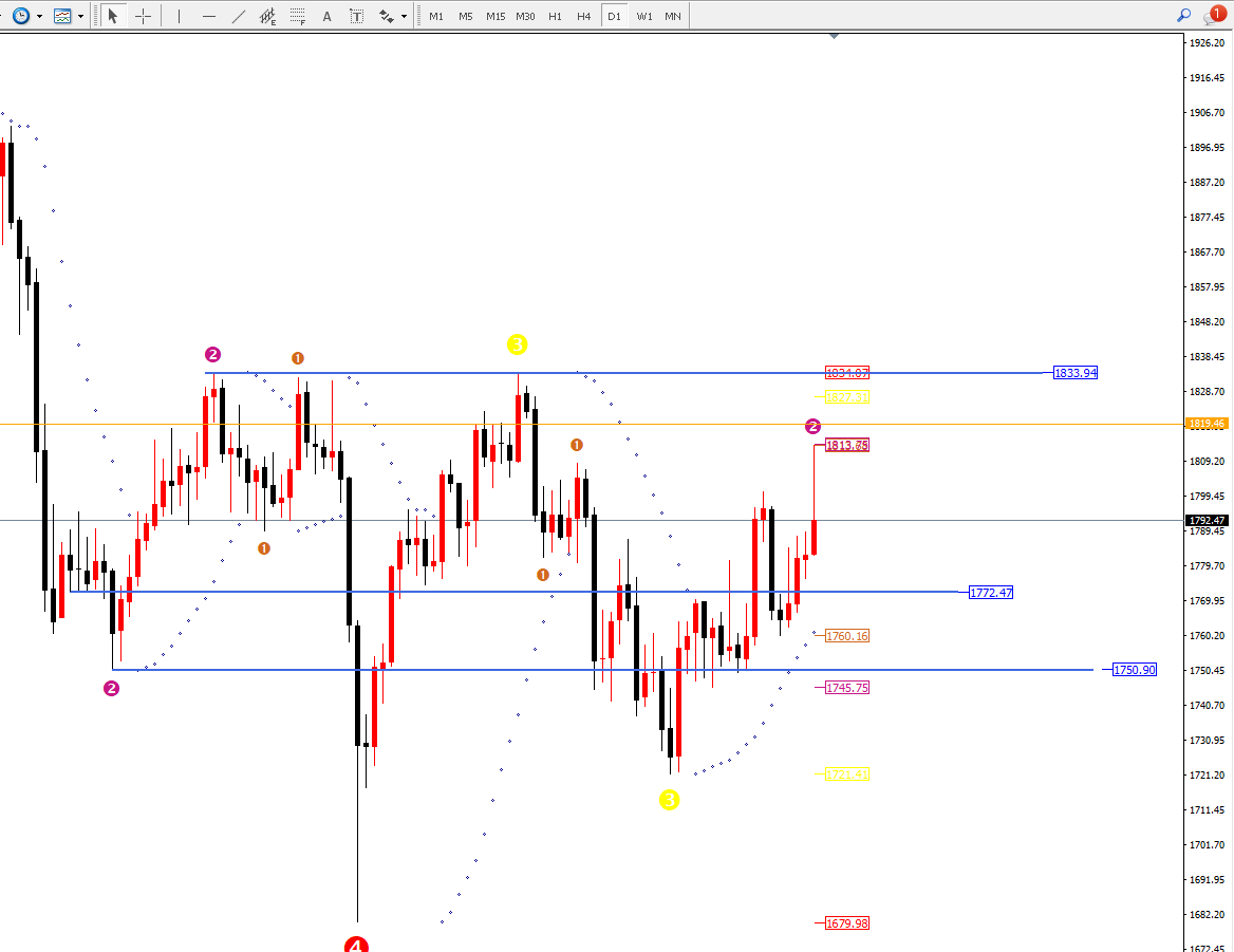 目前指标macd金叉放量运行,灵动指标sto勾头向上修复,所以日线指标显示日线多头。短期均线MA5、MA10、MA30呈现多头排列,所以我们目前关注点是均线MA60的支撑1779附近。日线蜡烛图因为收线较长上影线阳柱,所以蜡烛图顶部也是我们目前需要重点关注的压制点1814一线。