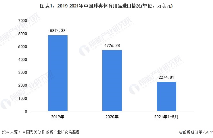 2019-2020年中国球类体育用品进口规模呈现下降趋势,从2019年的5874.33万美元下降至2020年的4726.38万美元。2021年1-5月,中国球类体育用品进口规模为2274.81万美元。