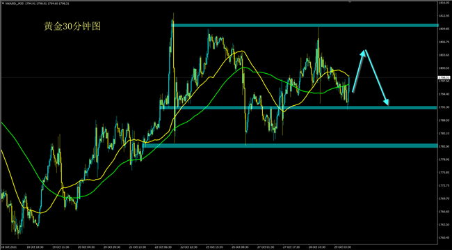 黄金当前还是1783-1810的大区间震荡,美盘更是有PCE数据公布,而且最近美盘行情多空来回大阴大阳的反复!这是震荡中最显著的特征!操作上切勿追涨杀跌,而是守压力支撑反向操作!