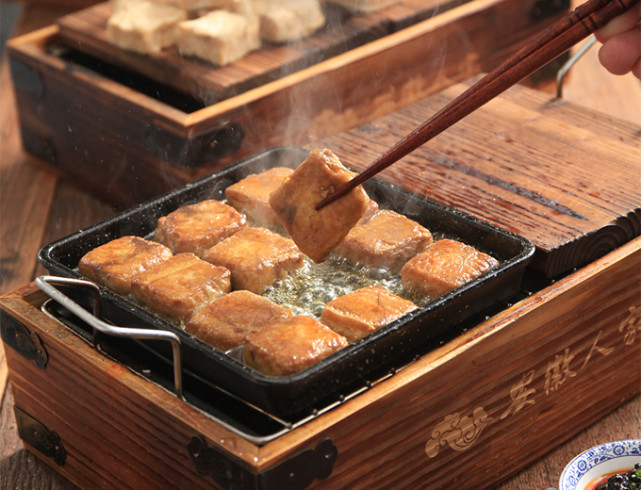 安徽人家的黄山毛豆腐,表皮微焦,内里却是腻滑的质地,有点类似正在融化中的蓝莓奶酪。