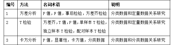 在日常的研究中,差异研究涉及以下三类方法,分别是方差分析,T检验和卡方分析,涉及相关术语名词汇总如下表。