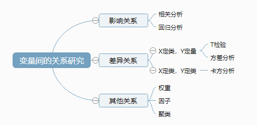变量间的研究关系大致可分为三种:影响关系、差异关系和其他关系(比如聚类、因子等)。