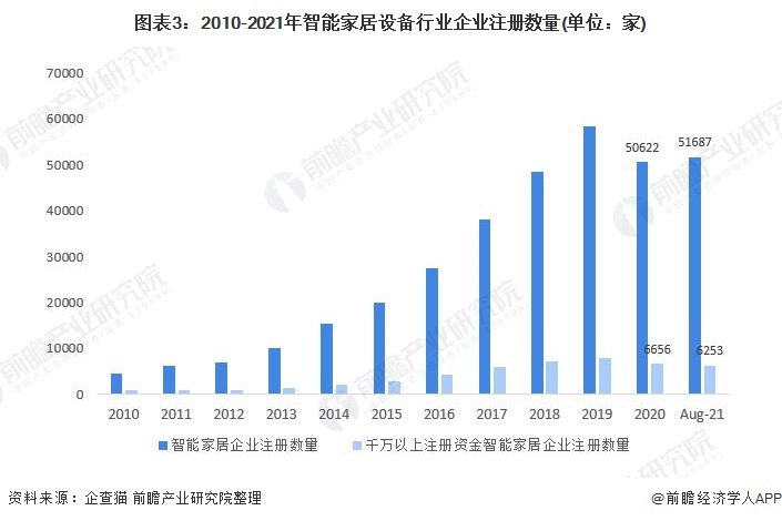 根据企查猫数据显示,2021年截止8月17日,中国智能家居设备注册企业共有51687家,注册资金在1000万以上的有6253家。经历了2020年疫情的影响,行业发展有所放缓,但随着经济的逐渐回暖,2021年我国的智能家居设备行业有投资加快的趋势,截至2021年8月的智能家居设备注册企业数量就已超过2020年全年数量。