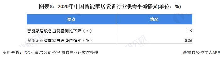 在供需平衡方面,“缺芯潮”使得在智能家居设备领域供应出现困难。基于疫情和国际形势的双重影响,全球芯片供需矛盾爆发,缺芯潮从汽车等领域一路蔓延到了智能家居领域,导致国内智能家居设备出货量同比下降1.9%。结合龙头企业海尔智家的产销数据,2020年,海尔智能家电销量达到10028万台/套,产量达到8579万台/套,产销比为0.86。由此可见,中国智能家居设备行业存在供不应求的现象。