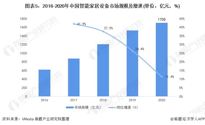 根据艾媒数据中心发布的数据显示,2016-2020年,中国智能家居市场规模持续扩大,到2020年达到1705亿元的市场规模。2016年开始随着产品成熟度的落地以及智能安防与智能家电市场的崛起,2017年智能家居增长幅度达到40%以上,尽管之后增速有所减缓,但增速均保持在25%以上,直到2020年因疫情影响,中国智能家居市场规模增幅降到11.4%。