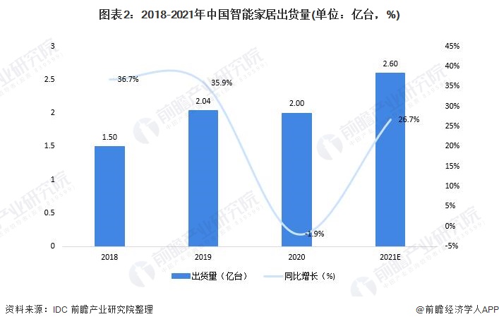 在新基建的背景下,随着5G通信技术、人工智能的快速应用与普及,万物万联互通已成为经济社会的发展趋势,智能家居也迎来发展机遇。据IDC公布的数据显示,2019年,中国智能家居设备出货量已达2.04亿台,同比增长35.9%;2020年,面对新冠疫情和上游供应紧缺带来的压力,全年中国智能家居设备市场出货量为2亿台,同比下降1.9%;IDC预计,2021年中国智能家居市场将走出阴霾,迎来反弹,预计全年出货量接近2.6亿台,同比增长26.7%。