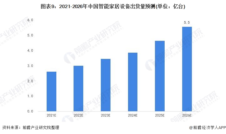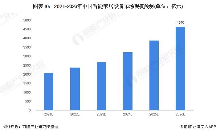 Statista发布的《2021年全球智能家居市场展望报告》预计2020至2025年中国智能家居设备市场规模复合增长率为21.2%%。考虑到中国智能家居市场当前所面临的原材料短缺问题和中国信息技术发展情况,结合中国在全球市场规模中的大致占比情况,前瞻保守故计,2026年,中国智能家居设备市场规模将超过4600亿元。