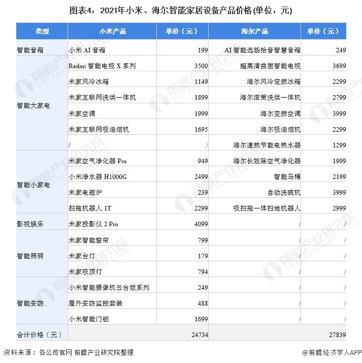 以国产品牌为例进行价格计算,假设各类智能家居设备产品均只购买一件,且所选产品均为品牌中价格较低的系列。小米的智能家电产品品种非常丰富,安置一套功能完善的小米智能家居设备大致花费在2万5千元左右;而老牌家电企业海尔的智能家居设备仅包括智能音箱和智能家电的价格就接近2万8千元。此外,近期华为全屋智能方案的价格也已对外公布,其中3房2厅(约100 m2)的全屋智能价格为99999元起,5房2厅(200 m2)的全屋智能价格14999元起,大概在6-8月份开售,首批覆盖了50个城市。