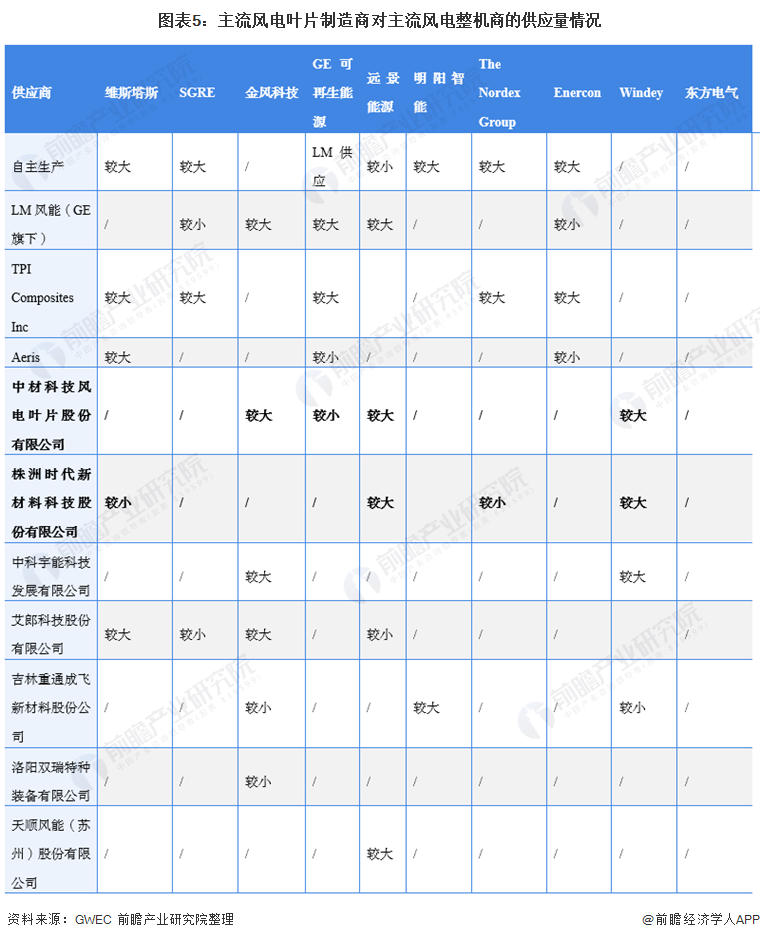 根据GWEC的《2020全球叶片供应链报告》的数据显示,中材科技目前将风电叶片供向金风科技、远景能源、Windey以及GE可再生能源四家公司,其中主要供应给金风科技、远景能源、Windey。而时代新材则是将风电叶片供向维斯塔斯、远景能源、The Nordex Group和Windey,其中主要供应给远景能源和Windey。