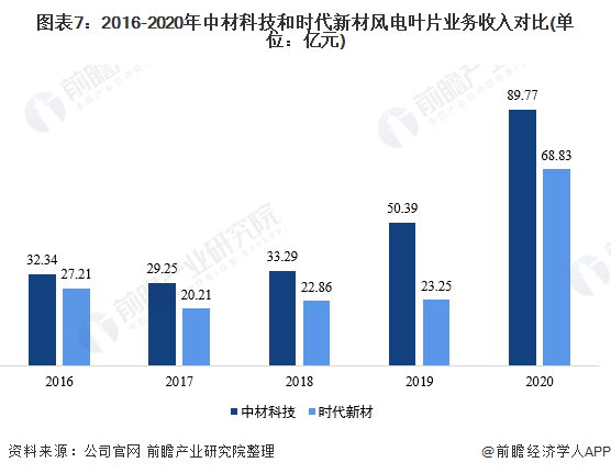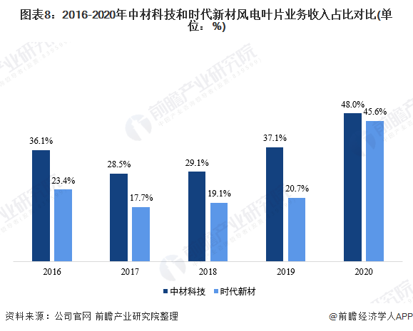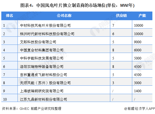 根据GWEC在2021年1年发布了《2020全球叶片供应链报告》指出中材科技风电叶片股份有限公司的叶片产能已经达到了10000MW/年,而供应链有7条;是目前我国名副其实的第一。而时代新材略微落后于中材科技,成为国内市场第二。