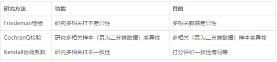 如果是多相关样本,并且目的在于研究差异性,则有Friedeman检验和CochranQ检验两项可用,但特别提示一点,CochranQ检验涉及的数据一定是二分类(即1和0这样的数据);如果是研究多相关样本的一致性情况,则可使用Kendall协调系数。