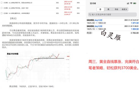 黄金经过一天的煎熬,终于迎来了收获的时刻,数据后直接大阳拉升突破新高,两单直接赚3700多美元。这也和笔者策略完美符合,跟上灵雁的节奏,安心赚钱!