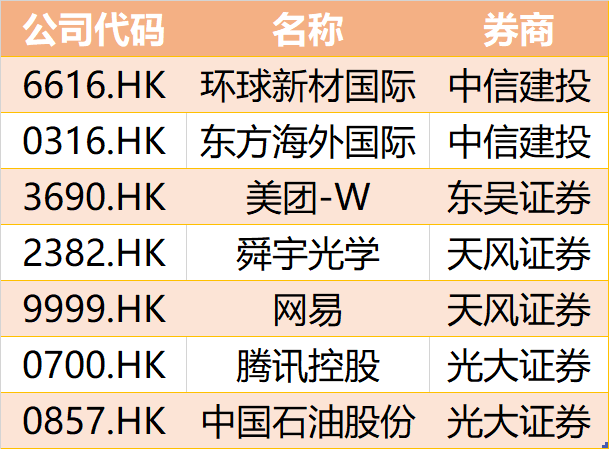 券商金股中的7只港股分别为:环球新材国际、东方海外国际、美团-W、舜宇光学、网易、腾讯控股、中国石油股份。