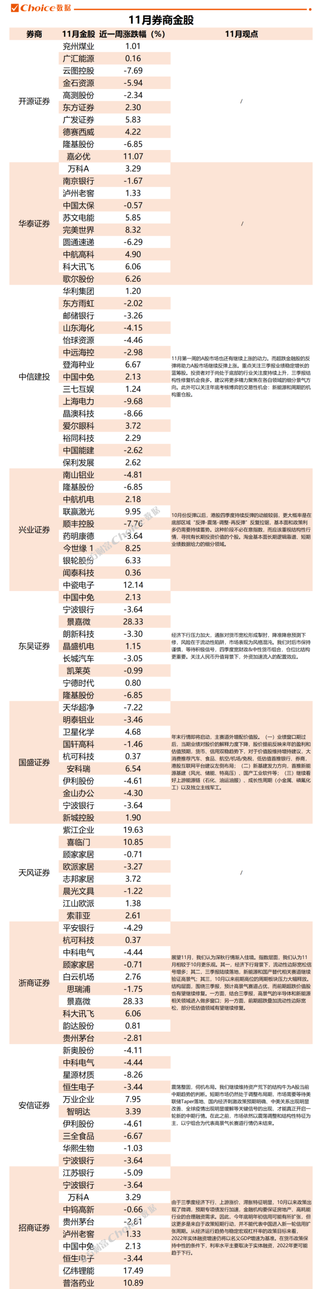 东方财富Choice数据整合了开源证券、华泰证券、中信建投、兴业证券、东吴证券、国盛证券、天风证券、浙商证券、安信证券、招商证券、平安证券、华安证券、国泰君安、山西证券、国信证券、方正证券、中银证券、中国银河、粤开证券、中原证券、海通证券合计21家券商的11月金股,共包含208只A股、7只港股。