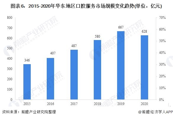 具体到华东地区来看,受益于民营口腔服务机构的快速发展,华东地区成为我国最具发展潜力的口腔服务市场。2015年以来,华东地区口腔服务市场规模呈现持续增长的发展态势,到2019年,华东口腔服务市场规模已提升至667亿元,2020年,受疫情影响,全地区口腔服务市场规模小幅回落至628亿元。