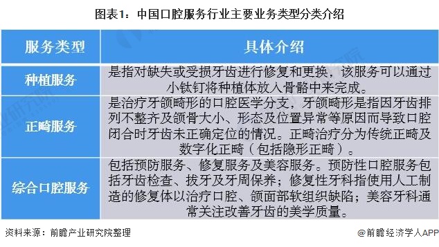口腔服务行业是指口腔医疗保健提供商提供的旨在维持口腔健康的服务。与欧美国家相比,中国的口腔服务行业起步较晚。按照口腔服务方法的类型,中国的口腔服务科分为种植服务、正畸服务和综合口腔服务等多种类型。