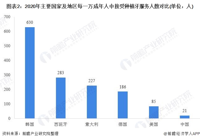 受益于近30年人民经济生活水平的快速提升和牙科技术的跨越式进步,口腔服务行业从1990年代开始进入快速发展期,我国人均GDP的快速增长及民营牙科连锁诊所兴起等因素推动了口腔服务和消费型医疗保健市场的快速发展,但相较于海外口腔服务发展较为成熟的地区,我国口腔服务普及率仍处于较低水平。以牙科种植为例,据调研数据显示,在中国2020年每一万成年人中,约有21人会在牙科种植方面接受专业治疗服务,而在美国和韩国,这一数据分别为85人和630人。由此可见我国口腔服务市场存在巨大潜力较大发展空间。