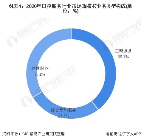 从业务类型构成来看,目前,我国口腔服务市场主要以正畸服务和种植服务为主。近年来,随着种植服务市场的快速发展,其市场规模与正畸服务市场规模的差距逐渐减小,2020年,我国正畸服务市场规模约为647亿元,占口腔服务市场总规模的39.7%;种植服务市场规模约为550亿元,占口腔服务市场总规模的33.8%。