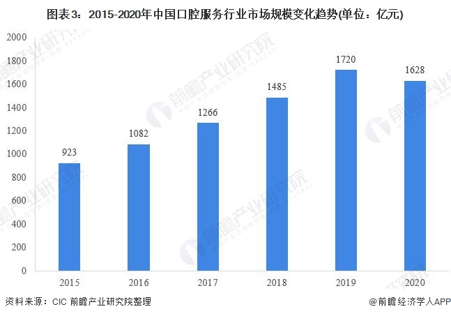 在一系列利好政策及其他增长因素的推动下,2015年以来,我国口腔服务行业发展迅速,据调研机构CIC统计数据显示,我国口腔服务行业市场规模由2015年的923亿元提升至2019年1720亿元,2020年,受新冠肺炎疫情影响,部分口腔服务机构业务受阻导致口腔服务行业整体市场规模小幅回落至1628亿元。