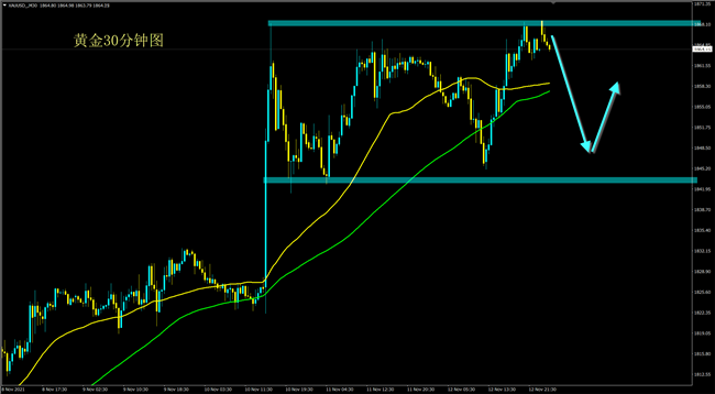 黄金大涨后需要震荡修正,而且上方1868位置多次上攻都没有突破,压力位置明显,所以早盘依托此位置的压力线干空看跌,黄金按照震荡思路对待!关键性的压力位置,多空转折的分水岭,不破不立,破位翻转!