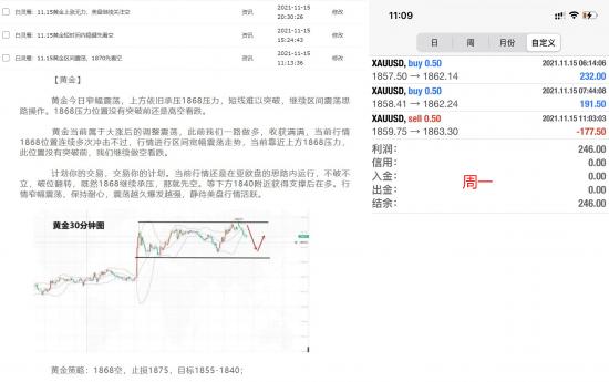 周一的黄金,和笔者预测大体相同,区间震荡,守住压力就是做空。不急不躁,稳定盈利。共交易三单: