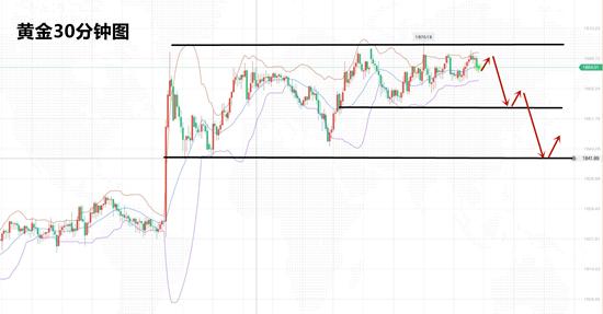 黄金此前强势上涨,而没有太大的回调,当前行情遇阻,正好借压力位置调整一波,当前的震荡区间暂定1840-1870区域内运行。高位压力做空,低位支撑做多,只有区间被突破后,我们才能顺势跟进。区间内千万不要轻易的追涨杀跌,而是守压力支撑分别反向操作。
