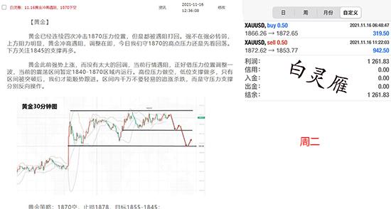 第一单:1866.26进场多,1872.65出局,获利319.50美元。