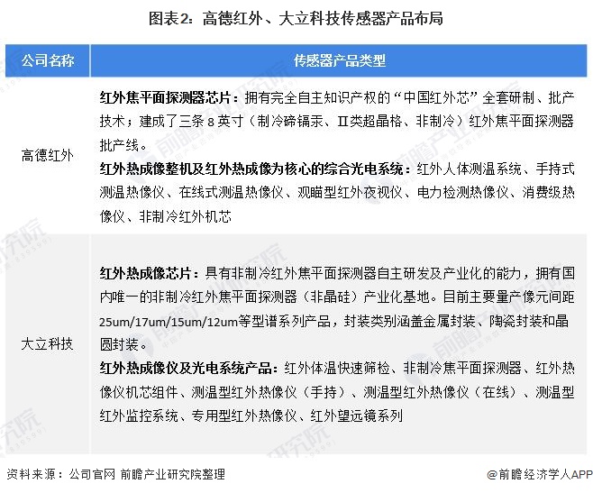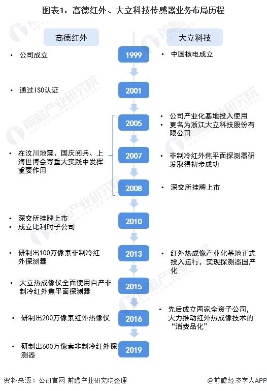 随着科技的发展,传感器早已渗透到诸如工业生产、宇宙开发、海洋探测、环境保护、资源调查、医学诊断、生物工程、甚至文物保护等等极其之泛的领域。目前,高德红外和大立科技是中国传感器行业红外传感产品的龙头企业,两家企业在传感器业务上的布局历程如下:
