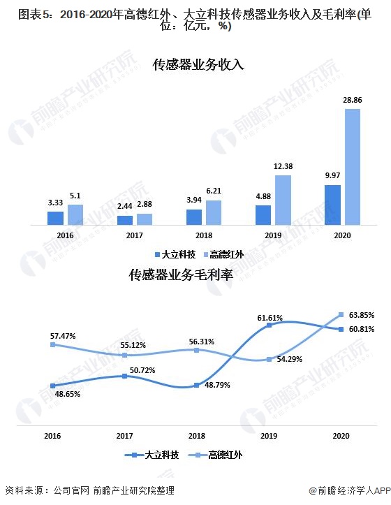 从传感器业务的经营情况来看,2016-2020年高德红外传感器业务收入均领先于大立科技,2020年高德红外传感器业务实现收入28.86亿元,大立科技传感器业务实现收入9.97亿元。
