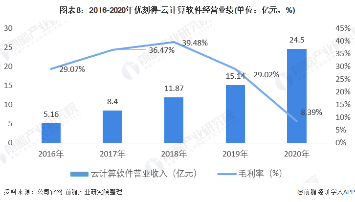 近几年优刻得云计算软件营业收入逐渐增加,2016-2020年云计算软件年复合增长率达到47.6%。但云计算软件毛利率呈现先增后减态势,2020年云计算软件毛利率降至8.39%,毛利率下降原因包括价格下调导致主要产品自身毛利率下降及服务器升级换代使得一段时间内成本叠加。总体来说优刻得云计算软件经营业绩处于较好水平。