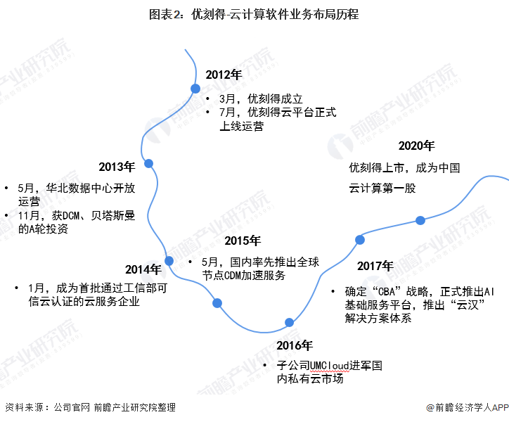优刻得相较其他传统软件公司而言成立较晚但布局速度较快。优刻得于2012年成立,并在同年推出优刻得云平台并正式上线运营;2014年成为首批通过工信部可信云认证的云服务企业;2016年优刻得子公司UMCloud进军国内私有云市场;2020年,优刻得在科创板上市,成为中国云计算第一股。具体布局历程如下: