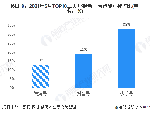 其次,相比于抖快,视频号头部化不明显。根据新榜数据,2021年5月,TOP10视频号、抖音号、快手号的月度点赞占TOP200账号点赞总数的比例分别为13%、19%和33%。