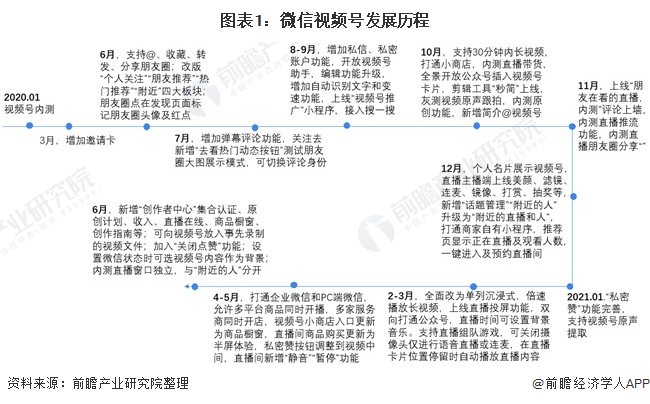 目前视频号的用户主要分为两类,一类是拥有视频号入口,但是没有视频号账号,只能观看阅读不能发布内容的用户;另一类是通过申请或被内测得到视频号开通资格的创作者,其能够浏览且发布视频号内容。2020年1月以来,微信视频号生态逐渐完善其发展历程如下: