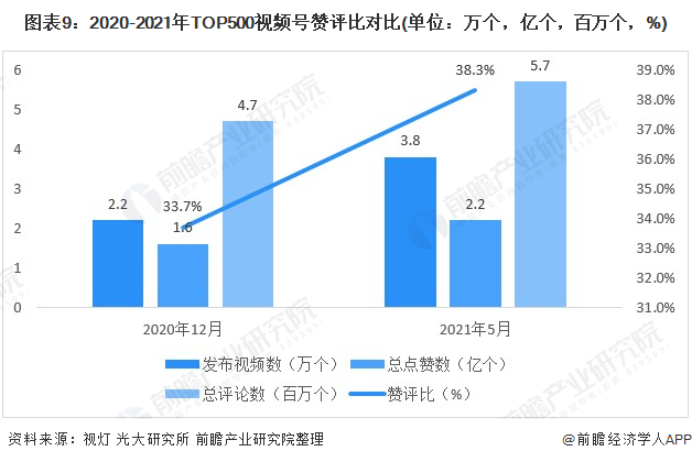 根据视灯数据,视频号TOP500账号赞评比从20年12月的33.7升高到21年5月的38.3。评论行为比点赞需要用户投入更多的时间和精力,体现出更高的用户参与度,视频号赞评比升高,说明目前用户与视频号的互动尚不足。