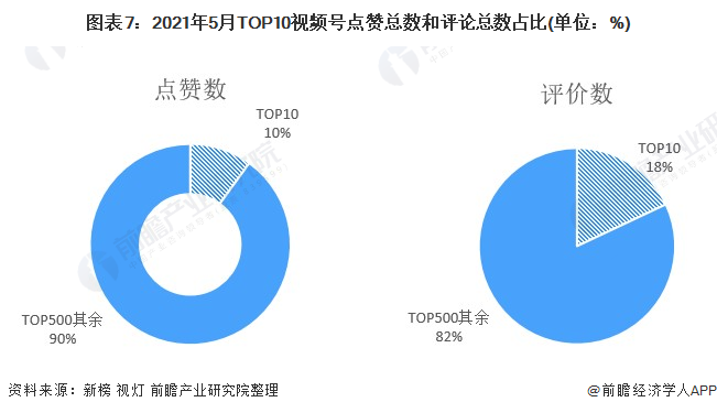 主要表现在,首先,点赞、评论数较为分散,未集中于头部视频号。根据视灯数据,2021年5月,视频号榜单排行TOP10的视频号合计点赞总数、评论总数分别占榜单全部视频号(TOP500)合计的10%和18%,其中榜单第1位的人民网点赞占比1.4%,评论占比4.8%。