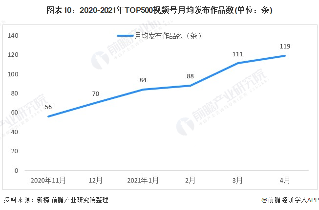 当前,公众号博主持续向视频号迁移,作品发布积极性持续上升。视频号具备社交传播裂变、私域流量转化更高效、商业化路径更短的优势,给予短视频内容创作者全新的流量与商业化空间,吸引了内容创作者大量涌入。2021年6月,共2000万的公众号账号已有400万变成了视频号的创作者,视频号创作者的活跃度在持续增加。根据新榜,2021年4月视频活跃账号持续增长,500强视频号月均发布作品数由2020年11月的56个/人上升至2021年4月的119个/人,半年内提高112.5%。