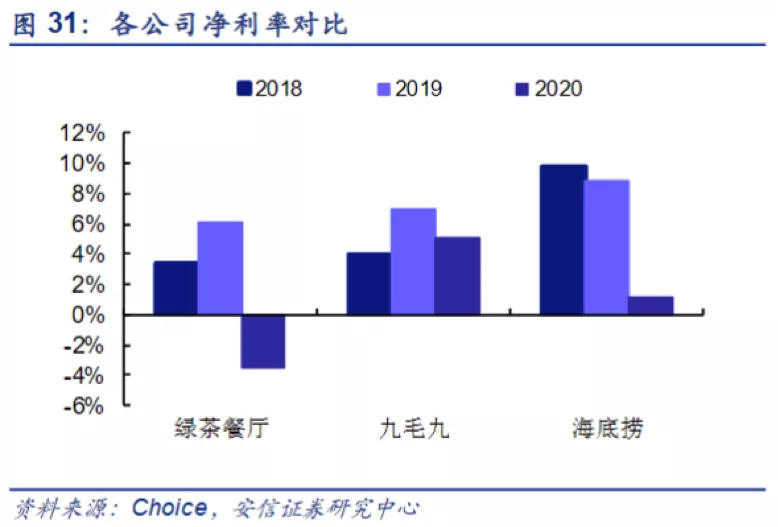净利率方面,2018、2019年海底捞(8%-10%)>九毛九的(5%-7%)>绿茶餐厅(5%-6%)。